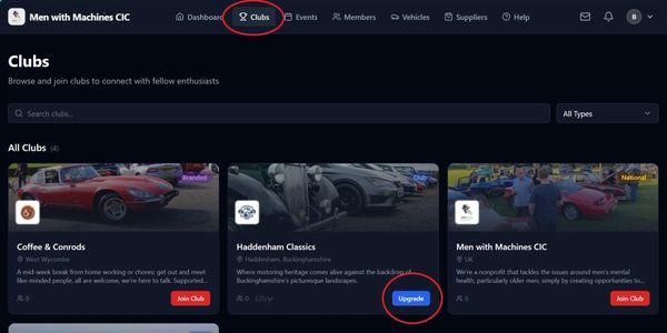 Once you have signed up. Click on the Clubs tab at the top and then where you see Haddenham Classics, click on Upgrade. See screenshot opposite.